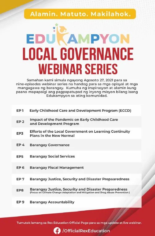 Watch the episodes of Edukampyon Local Governance Webinar Series on the official Facebook page of Rex Education.